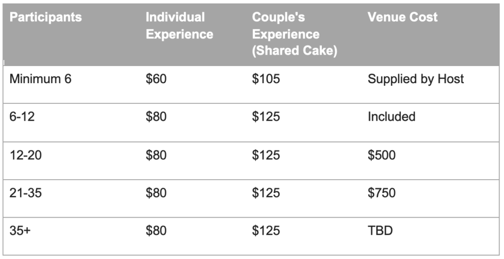 First, you can set up a private Cake Decorating class for your friends and family (minimum 6 participants) at our venue or a location provided by you, the host! See price chart below: